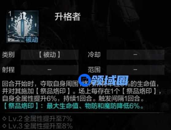 回合开始时,夺取自身周围1格内所有单位6%的生命值,并对其施加【祭品烙印】。场上每存在1个【祭品烙印】,自身全属性提升6%,持续1回合。触发间隔1回合。