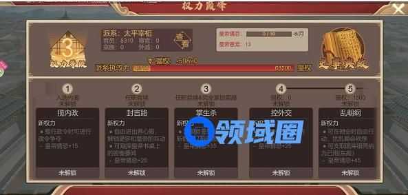 1.权力等级:初始权力等级3,根据强权数值提升,强权越高权力等级越高,权力等级可以解锁更多的权力操作及史册典故。