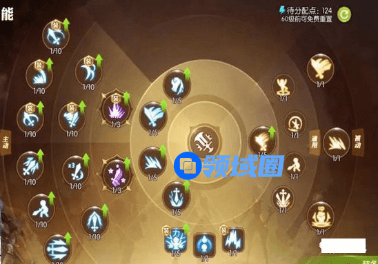 技能方面分为左手边的主动技能及右手边的被动技能,其中中间红色攻击按键周边的都是剑圣的基础技能,可以看出主动基础技能重斩分支除了很多技能,这些技能都是可以替换的,大家可根据自己的打法选择一套最佳的技能进行佩带。