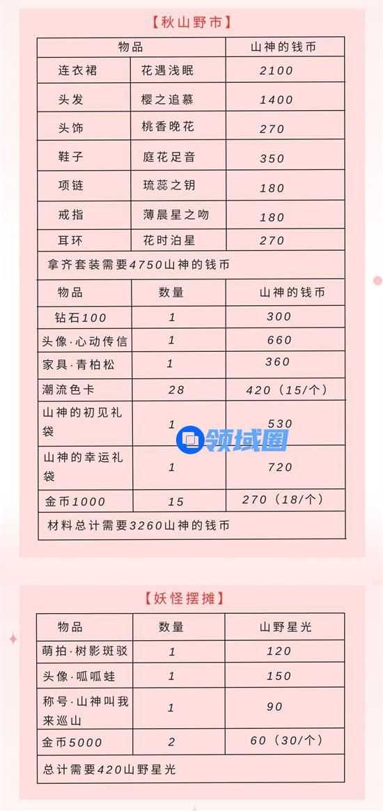 山神的钱币可以在秋山野市兑换下列奖励: