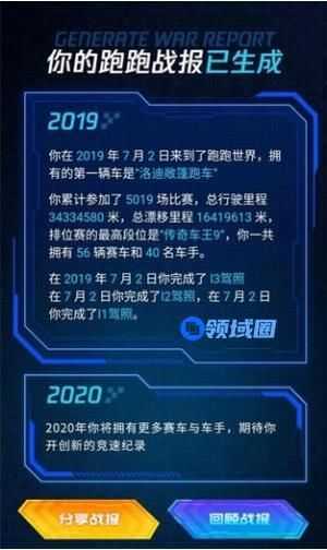 完成账号的登录之后将会自动生成相应的战报,其中会提及玩家2019年的入驻时间、第一辆拥有的车、累计的比赛数、赛程、最高段位、以及收藏等多方面的成就。
