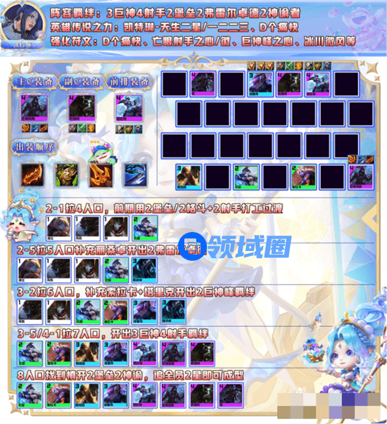 2.阵容羁绊:3巨神峰4射手2堡垒2弗雷尔卓德2神谕者。
