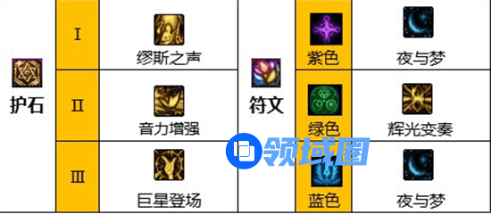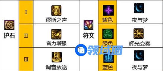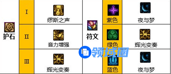 符文方面由于当前版本现在范围性贴膜较多,紫色恢复上限也可纳入考虑范围,故可以根据个人喜好将黄色替换为紫色