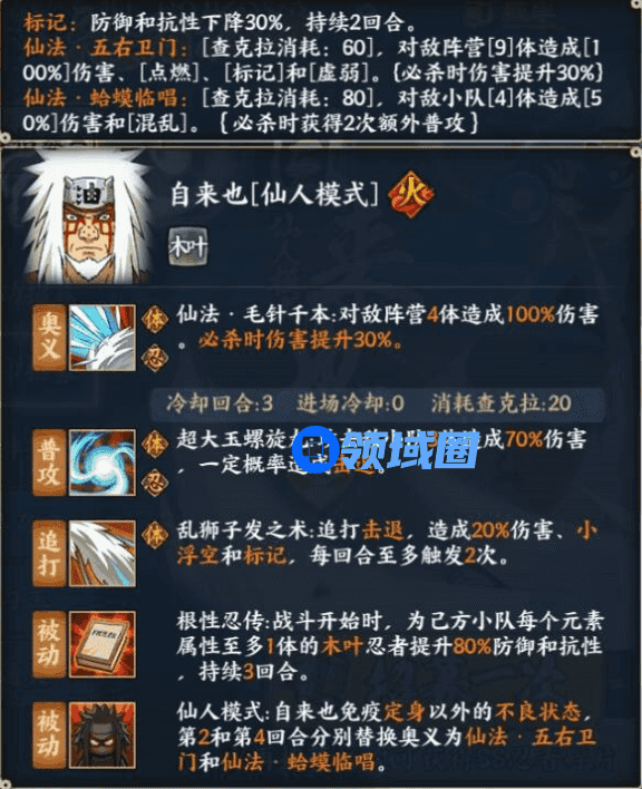 根据自来也【仙人模式】的核心技能“根性忍传”,可以大概确定该忍者的搭配思路。