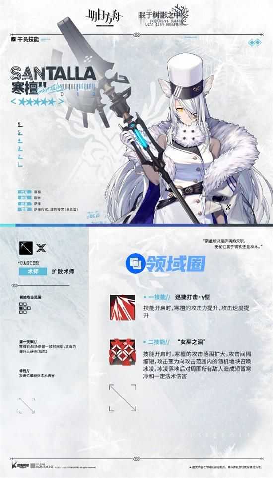 二技能【“女巫之泪”】开启时,寒檀的攻击范围扩大,攻击间隔缩短,攻击变为向攻击范围内的随机地块召唤冰凌,冰凌落地后对周围所有敌人造成短暂寒冷和一定法术伤害。