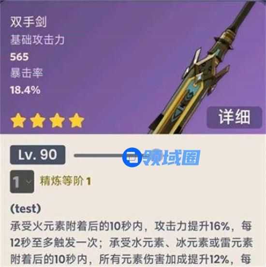 2、武器技能:承受火元素附着后的15秒内,攻击力提升16%,每12秒至多触发一次;承受水元素、冰元素、雷元素或草元素附着后的15秒内,所有元素伤害加成提升12%,每12秒至多触发一次。