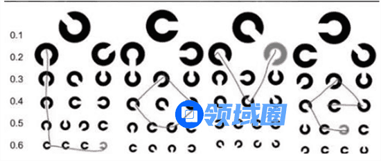 解析:将视力表分为四部分。C的开口方向是这个符号的指向,看不清的符号是指向中止的位置,其中字母O没有中止位置,所以没有“看不清”的符号,只需按照看不清符号溯源即可。即可得到love,如下图:
