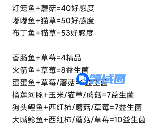 大嘴鲶鱼+西红柿(10),狗头鲤鱼+西红柿(7),火箭鱼+草莓(8),榴莲河豚+蘑菇/玉米(7),大嘴鲶鱼+草莓(10)。