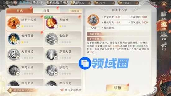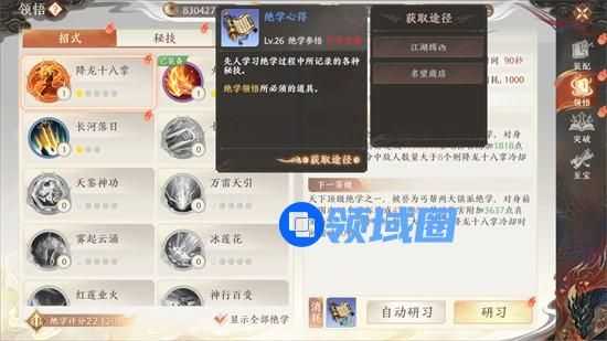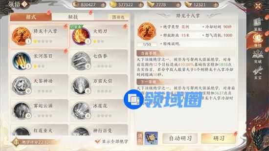 可以通过自动研习快速提升绝学等级,可以预览下一等级绝学效果。