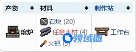泰拉瑞亚熔炉是使用3个火把、4个任意的木材和20个石块在工作台上制作获得的,这三种材料都是游戏一开始就可以大量获取的,木材直接砍树就可以获取了,这里需要注意的是,制作熔炉不限制木材的种类。石块则可以说是遍地都是了,也是最常见的矿物了。火把是需要使用木材以及凝胶制作,初始世界击杀史莱姆就可以获取到大量的凝胶了。