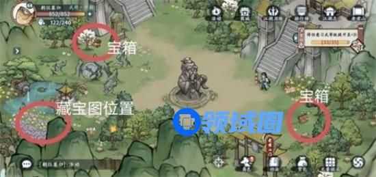 2、进入老君山后,藏宝图的位置就在池塘边的花丛之中。