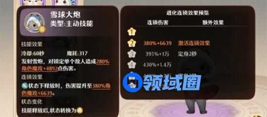 1、发射雪炮攻击目标敌人,造成4892点伤害和280%的角色魔攻。