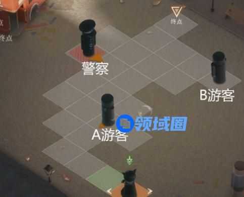 4、当我们到达以上图这个位置的时候我们就能直接挡住B游客前进的路线,导致游客无法前进这个时候我们直接走两步就到达重点了,这关就算过了一共用了17步。