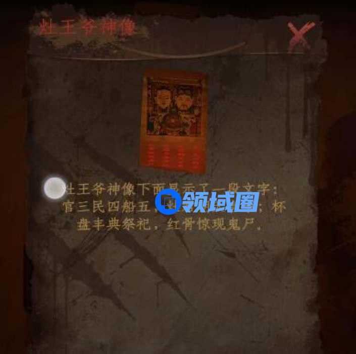 5、将红骨丢进铁锅煮,水蒸气会让灶王爷神像上显示文字“官三民四船五”,对应的是铁盒上而定密码【534】