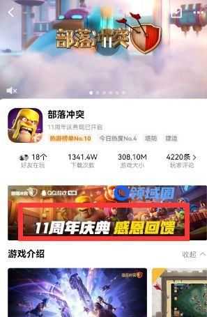 1、首先用户需要先登录手机QQ,然后搜索【部落冲突】,进入游戏详情页,点击中央位置的周年庆宣传图片。