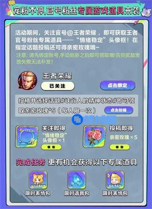1、活动期间,关注官号@王者荣耀 ,即可获取王者官号粉丝专属道具一“情绪稳定”头像框。