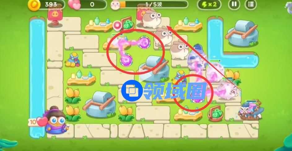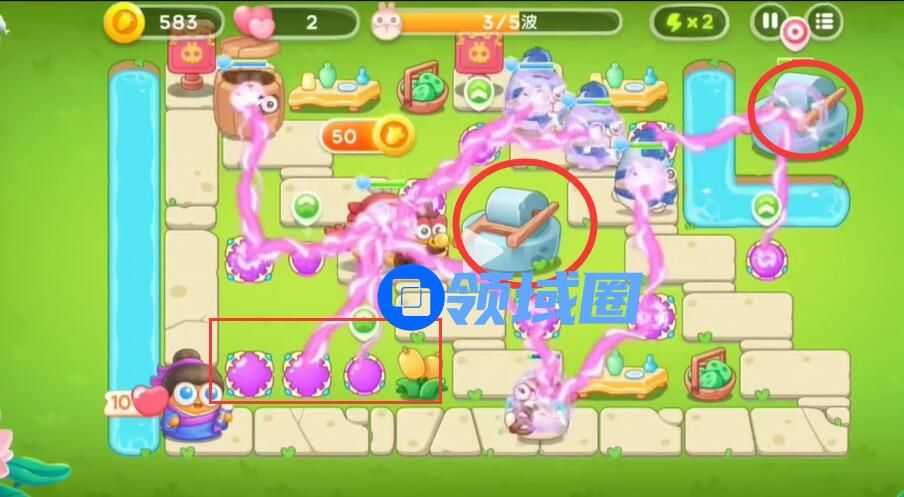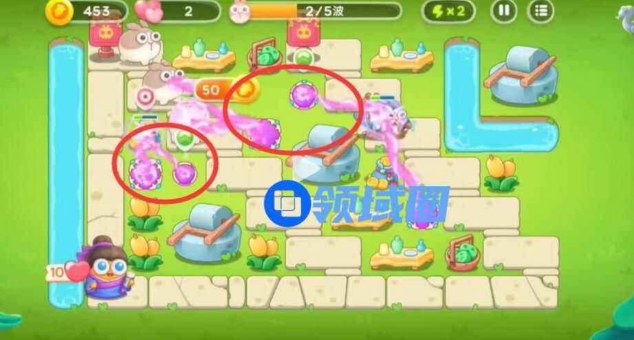 1、开局在这里放几个魔法球可以将右边出口的兔子快速的清理。