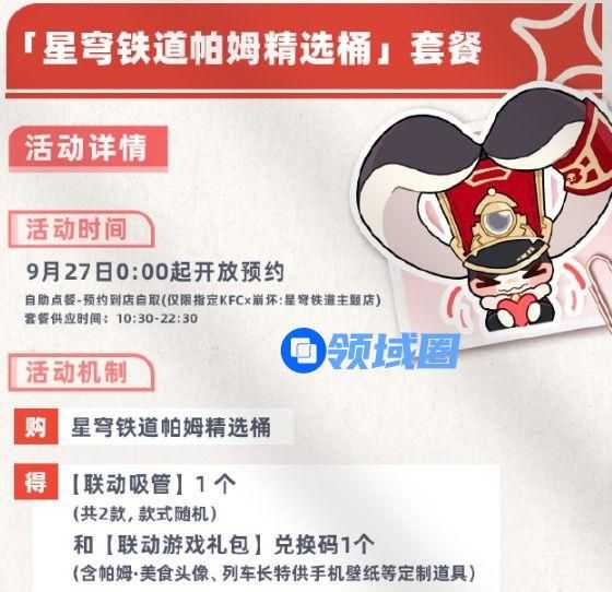 9月27日0点起开放预约指定主题门店购「星穹铁道帕姆精选桶」,得「联动吸管」1个(共2款,随机发放)和「联动游戏礼包」兑换码1个(内含帕姆·美食头像、列车长特供手机壁纸等定制道具)。