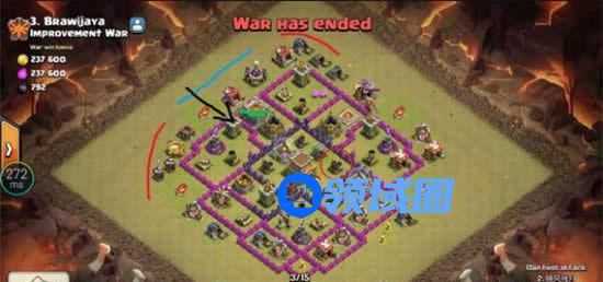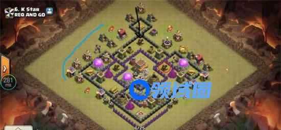 这个阵可以学着变通。像这种有一个防空比较靠外,旁边也没什么其他防御建筑。援兵可以要野猪,12点方向放野猪,直接敲了加农炮和防空。差不多也死了。然后红圈闪电地震,龙蓝线处排开。