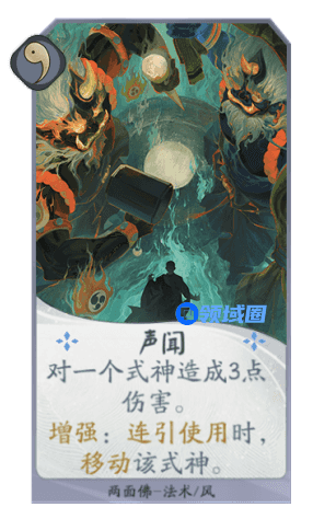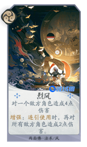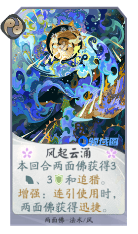2.两面佛的风牌,即非觉醒法术牌都比较灵活,拥有解后排的能力。在连引使用时,声闻造成伤害的同时可以移动敌方式神,风起云涌提供力量值加成的同时可以追猎,而烈风具有群体伤害的能力。