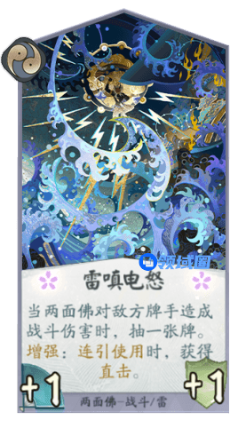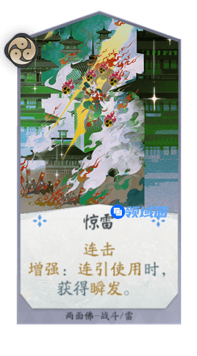 「连引使用」时,获得的直击效果可以令两面佛直接攻击敌方牌手,更加容易触发抽牌效果。进攻抢伤的同时,补充己方手牌资源。配合风起云涌等能提升攻击力的卡牌,雷嗔电怒能够发挥得更加出色。