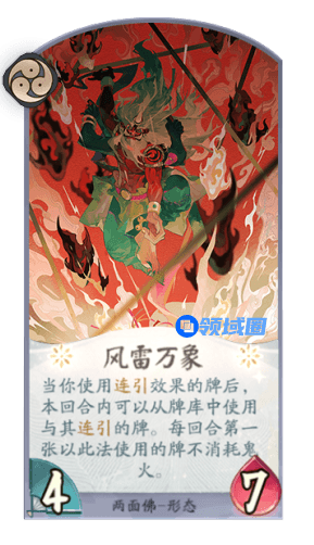 使两面佛在每回合使用「连引」效果的卡牌时,都能获得额外的收益。本回合能直接从牌库中使用「连引」过程中未被选择的卡牌,且第一张使用时不消耗鬼火。风雷万象提高了两面佛的后期爆发能力,为其单回合中的输出提供了更高上限。