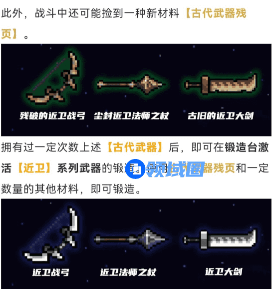 1、古代武器残页是新增的锻造材料,能够在战斗中概率获得,作用是锻造近卫列武器: