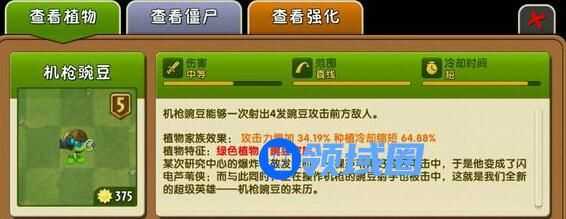 植物大战僵尸2是一款非常有趣的策略塔防游戏,这款游戏中玩家需要利用植物的特性来击败僵尸,保护自己的庭院,在这里你可以感受到更好的种植各种强力的植物来保护你的家园,游戏的防御绝对不是看上去那么简单,玩家需要更加合理的分配阳光才能帮助你更好的取胜,这里每一场战斗都是与众不同的,能让你更好的进行趣味的挑战。游戏中玩家可以了解图鉴中各个僵尸的弱点,帮助你更好的取胜。下面我来介绍一下机枪豌豆。