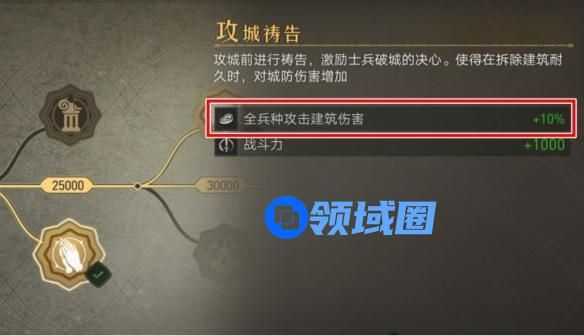 可以提升攻城伤害,在城防相关科技可以找到,建议在升级自身所需核心科技之后再行考虑。另一面发展方略的文化发展中,在达到25000点的分支可以选择攻城祷告,用以提升攻城伤害。