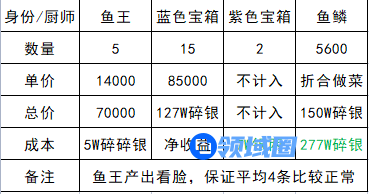 2)厨师钓鱼:鱼王产出增加后确实提高了不少,包括雪莲也是。鱼王比较看脸,不过平均4条问题不大,离谱的看到过一周8条鱼王。以每周5条鱼王为例,出售宴席菜可获得7W银两,另外蓝色结实的宝箱和鱼鳞都能折换成碎银,如果用心做菜一周通过钓鱼还可以获得300W碎银(虽然半下琢磨都点不到)。