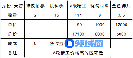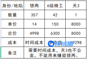 7)陨星地焰:一共5000银子,42个6级精工,大概率1个天3。天三实际价值在1W5,也就是2W5左右的收益。虽然没有成本但是收集14个金色材料的时间成本还是比较高的。