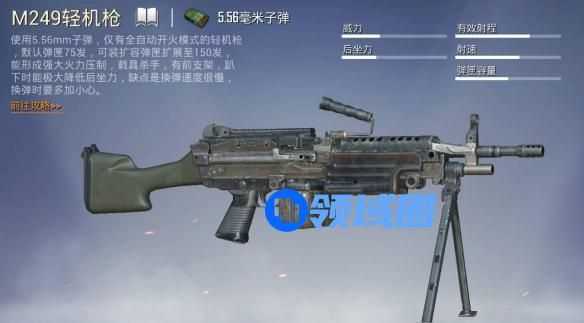 5.M249,这把冲锋枪,具有高容量的弹夹容量,具有“近战之王“的称号,对于摧毁载具具有很大帮助,它的缺点就是换弹夹的速度较慢。