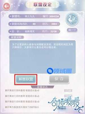 进入联盟设定之后,右边按钮中,如果是会长,则会显示“解散联盟”,如果是会员,则会显示退出联盟的字样。