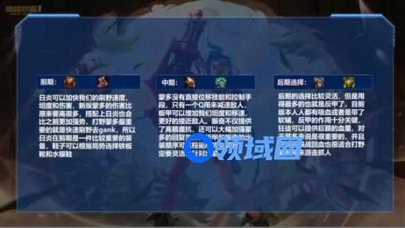 相对其他装备,第一件还是日炎最合适,日炎可以加快我们的刷野速度、生命值和伤害,对于蒙多来说是一个全面的提升,不仅前期对拼猛,对我们的发育来说也是非常快的。之后可以根据局势来决定先出护甲还是魔抗,如果对方法师发育好我们就先出振奋,振奋提供了很高的魔抗,可以加强我们的回复能力,对蒙多再适合不过了。如果对方AD发育比较好我们就先出板甲,板甲不仅提供了很高的坦度,还可以增加我们的移速帮助我们更好的去游走支援队友。后期的出装比较灵活多变,但是比较常用的还是反甲和狂徒,反甲可以压制对方的吸血和回复效果,狂徒搭配振奋可以利用脱战快速回满血,并且狂徒还提供了巨额的血量,很适合蒙多这种坦克。鞋子可以根据局势选择铁板靴和水银鞋,附魔可以选择石像鬼、救赎、传送。