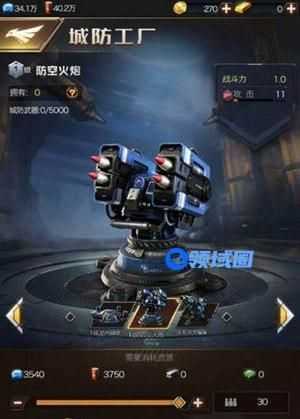 在城防工厂里建造碉堡、防空火炮等都可以增加城防武器战斗力,越高级的城防工厂能制造越高级的城防部队。