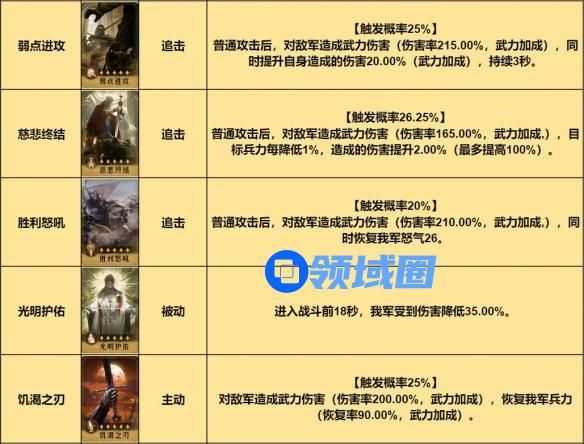 ● 虞夫人:推荐使用光明护佑替换钢铁之躯,进一步提升部队抗性;另外一个技能持久战可保留,或者替换成之刃削减回复增加输出,替换成胜利怒吼辅助输出提供回怒。