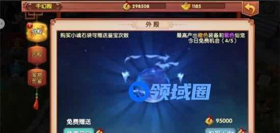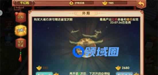 “外殿”通过消耗铜币来进行开启,最高可以产出橙色装备和紫色仙宠,每日都有固定的免费开启次数,开启一次以后有一定的冷却时间,如果你购买小魂石袋,系统会送你一定的开启次数,当然若是猎妖师的铜钱足够,小编建议可以直接开启十次,这样会更大几率获得橙装和紫宠。
