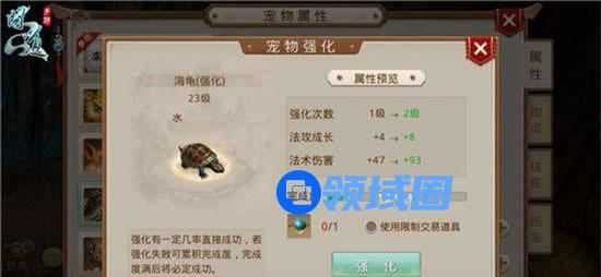 宠物强化也是宠物培养的一个重要部分,在人物等级达到65级之后开放宠物强化功能。强化之后宠物的部分成长和属性会有非常长足的进步,宠物也因此变得十分强 大。相比于端游来说,现在宠物强化十分简便,只需要使用“宠物强化丹”便可对宠物进行强化,“宠物强化丹”可以在商城里进行购买,强化有几率直接成功,失 败了也会累加一定的强化完成度,完成度满了之后必定成功。目前来说,宠物的强化次数上限为12次,比如要强化宠物的法攻成长,则宠物的法攻成长最多只能强 化12次。强化之后宠物的后缀变为(强化),十分酷炫。