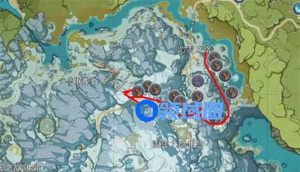 从覆雪之路的入口出发,一直沿着这条线上去就可以了。