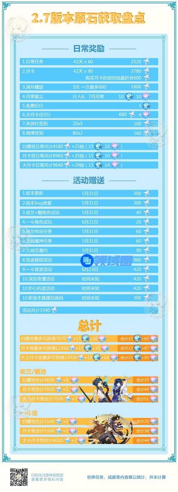 原神是一款开放式的大世界高自由度的冒险游戏,游戏有着超大的地图,后续还将不断更新,同时游戏中有着超多的游戏角色,总有一款是玩家所喜爱的。游戏中还有着众多的风景可以观赏,同时还设立了观景点,喜欢观看风景的玩家可以尝试去每个风景点打卡,还会有专属的风景截图哦。原神也是一款角色培养游戏,有着武器,圣遗物,天赋,命之座等多种培养方式,同时游戏也有着各种有趣的玩法,活动中可能会送出各种专属的小道具,使用这些小道具就能开启有趣的小游戏模式哦。原神中还有着尘歌壶玩法,玩家可以自由采集材料然后在尘歌壶中搭建属于自己的城市哦。接下来就为大家介绍一下原神2.7版本可以获得多少原石。