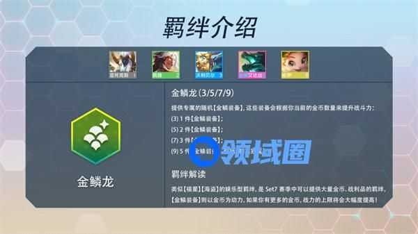 还有就是金鳞龙羁绊!当你激活金鳞龙羁绊时,就会马上获得金鳞装备,携带金鳞装备的英雄会获得属性加成,这个加成取决于你的金币数量,有点类似赏金猎人的重赏之下。金鳞装备除了能提供属性加成以外,还可以提供金币掉落,只要战斗力够强,你就能获得金币;只要有金币,就会有战斗力;这样便形成了永动!值得一提的是,如果你能开出9金鳞龙羁绊,那一定会获得【冠军之冕】,这将会是云顶之弈游戏里迄今为止最imba的装备,它可以使携带者造成基于当前金币9001倍的真实伤害!就算是给坦克携带,也可以瞬间清屏!