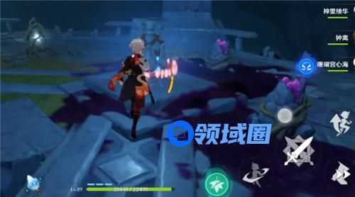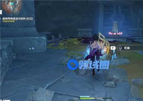 充能后,能量就空了,要回到仙灵的地方充满,再回来。装备层岩巨渊给的灯小道具,靠近紫色石头后,使用这个小道具释放能量将其净化。