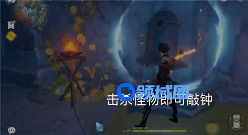 将所有紫色石头净化并且点亮所有柱子后,击杀出现的怪物,即可敲钟。