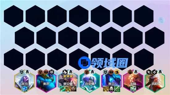 后期阵容:经济不好就5-1回合升8人口,阵容成型如上图所示,大搜一波,最起码全员二星,顺的话黛安娜能三星,注意4阶段前一只都没有刺客纹章给赛芬,我们在5阶段选秀有机会拿刺客纹章,所以不要把赛芬装备坐满了,不然就尴尬了,5阶段后面提升阵容质量,追三星黛安娜,如果赛芬来得多也可以追三星。