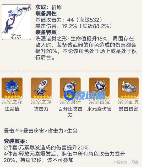 宗室圣遗物推荐辅助向夜兰使用,也可以给副c角色进行使用,输出和辅助兼备,放完技能就立马切换下一个角色(主c)进行输出,另外如果偏主C的话,也可以尝试2水2宗室去搭配,武器方面,目前毫无争议的就是若水,虽然基础攻击力低了,但其他属性整体拔高许多;