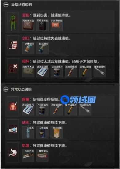 除此之外,还有恢复水量的各种饮料、恢复能量的各种食品、以及暂时免疫损坏负面状态的镇痛剂、止疼药等等,暗区先锋们也可以参考下图,查看部分常用药品和药品功能。