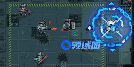 全身机甲构造,白色流线感造型,其臂膀悬浮着蓝色光环。白钢释放【神化】将化身大型人形机甲,挥舞手中的粒子大剑,并释放电流线路造型的剑气。