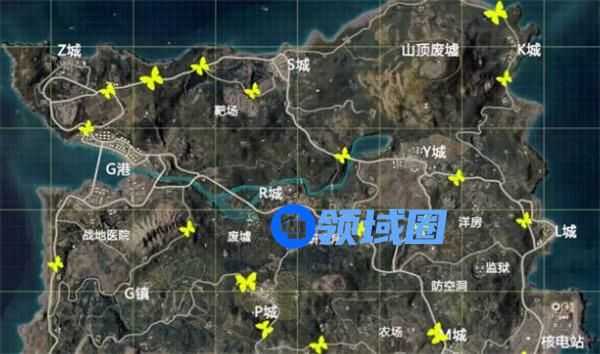 海岛地图的Z城、S城、 K城、水城桥北部、矿场、核电站、G港下城区公路、医院下面的车库, Y城麦田南侧公路军事基地西面野区跟军事基地。