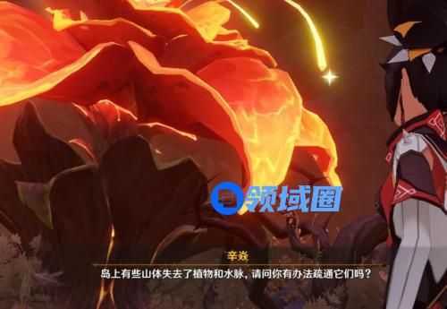 跟随任务指引,靠近巨大的花。与花交谈后,得知它需要获得寒山甘泉才能展开歌喉,并为我们打开后面的道路。