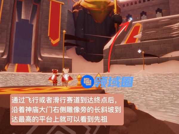 1、直接飞翔到霞谷的颁奖台位置,然后前往神庙的右边高台即可见到鞠躬先祖。